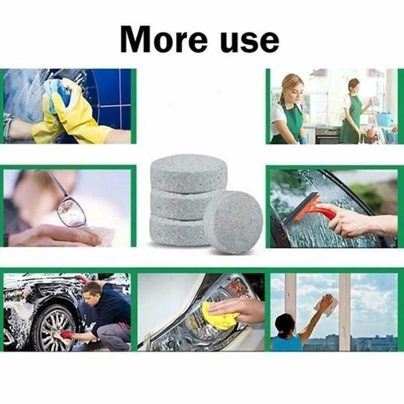 Product Description: Clean and decontaminate, reduce the friction between the wiper and the glass, and protect it. Instructions for use:This product is suitable for above zero degrees Celsius. Open the hood of the car, find the wiper, add a piece of wiper (if the glass is too dirty, it is recommended to add 2 pieces), wait for 5 minutes and then use it normally. A piece of conventional water can be exchanged with 4L of water. According to the normal volume of the liquid storage tanks, it is a piece of water, which can replace and be superior to traditional glass water!